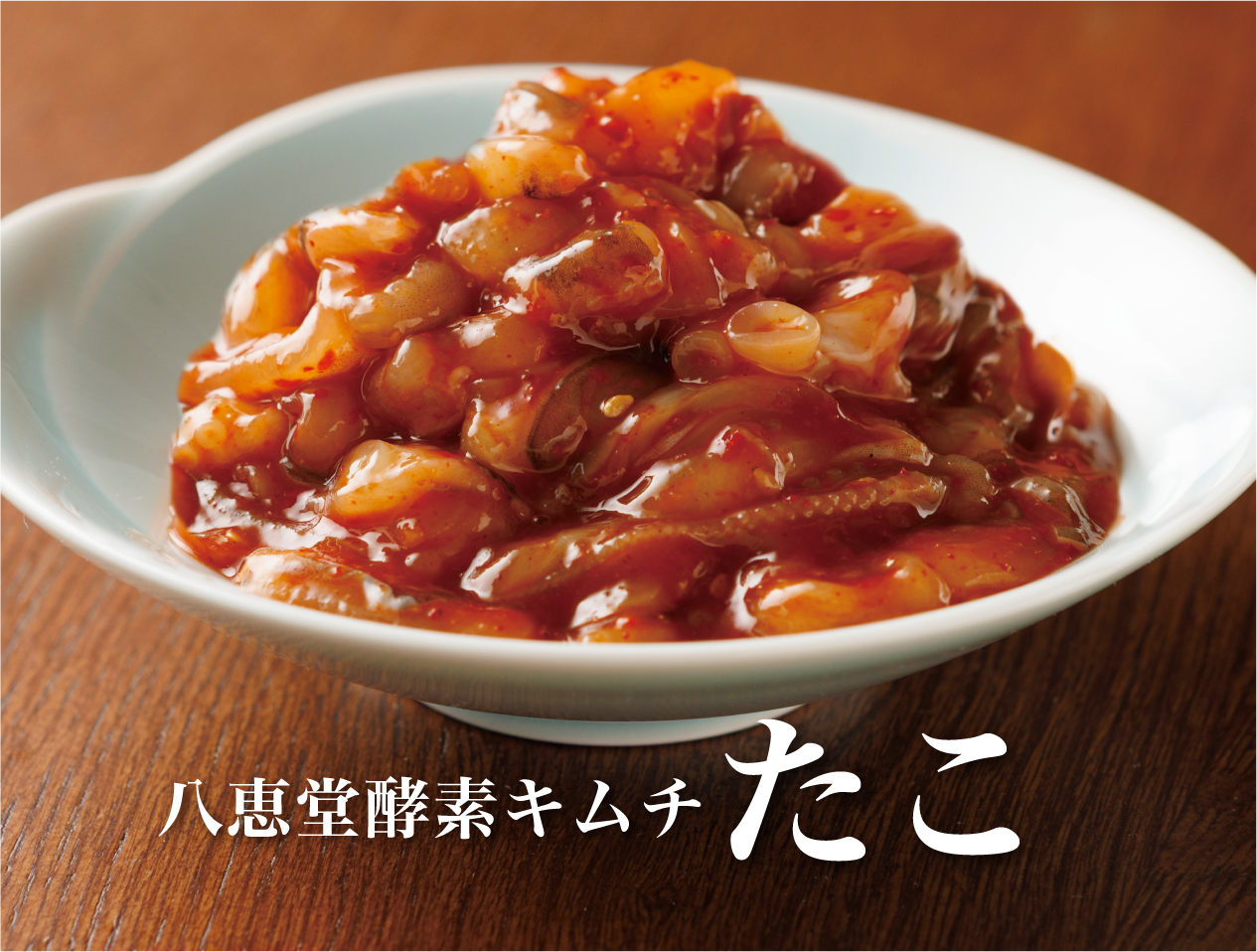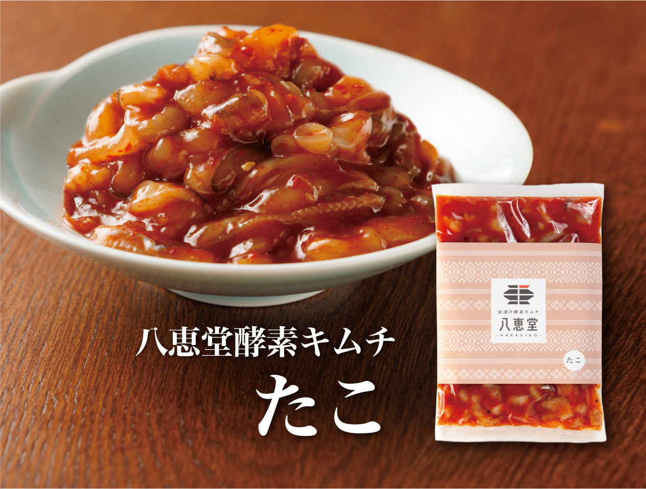 八恵堂酵素キムチの「たこキムチ」は、新鮮なたこをキムチにした冷凍キムチです。お酒のおつまみにも、ごはんのお供にも、相性抜群の海鮮キムチです。